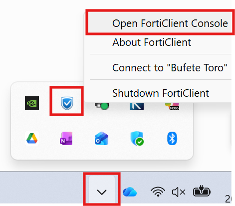 - Una vez instalada la aplicación abre la consola, dirígete a la barra de tareas (esquina inferior derecha de tu pantalla), localiza el icono de FortiClient, haz clic derecho y selecciona Open FortiClient Console.